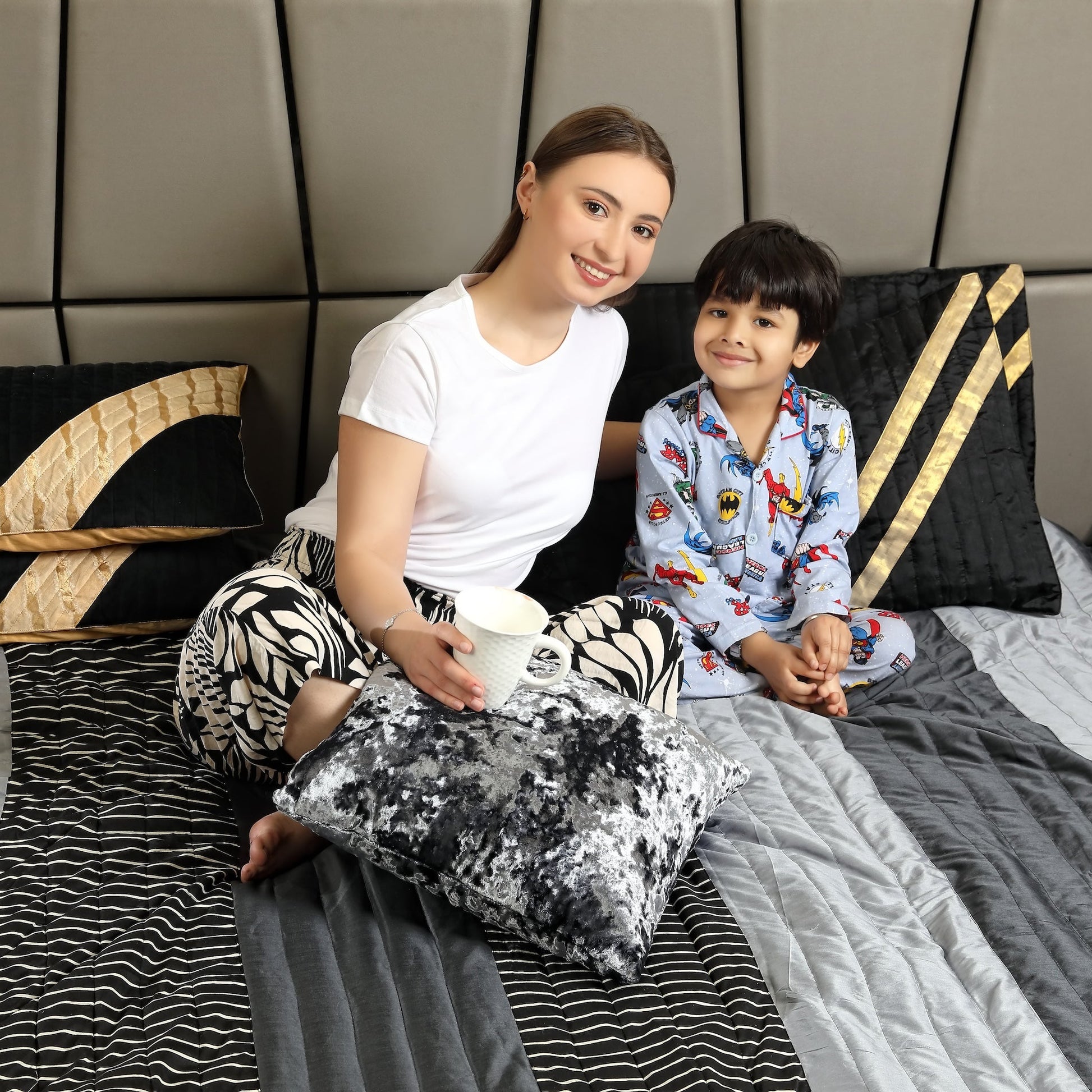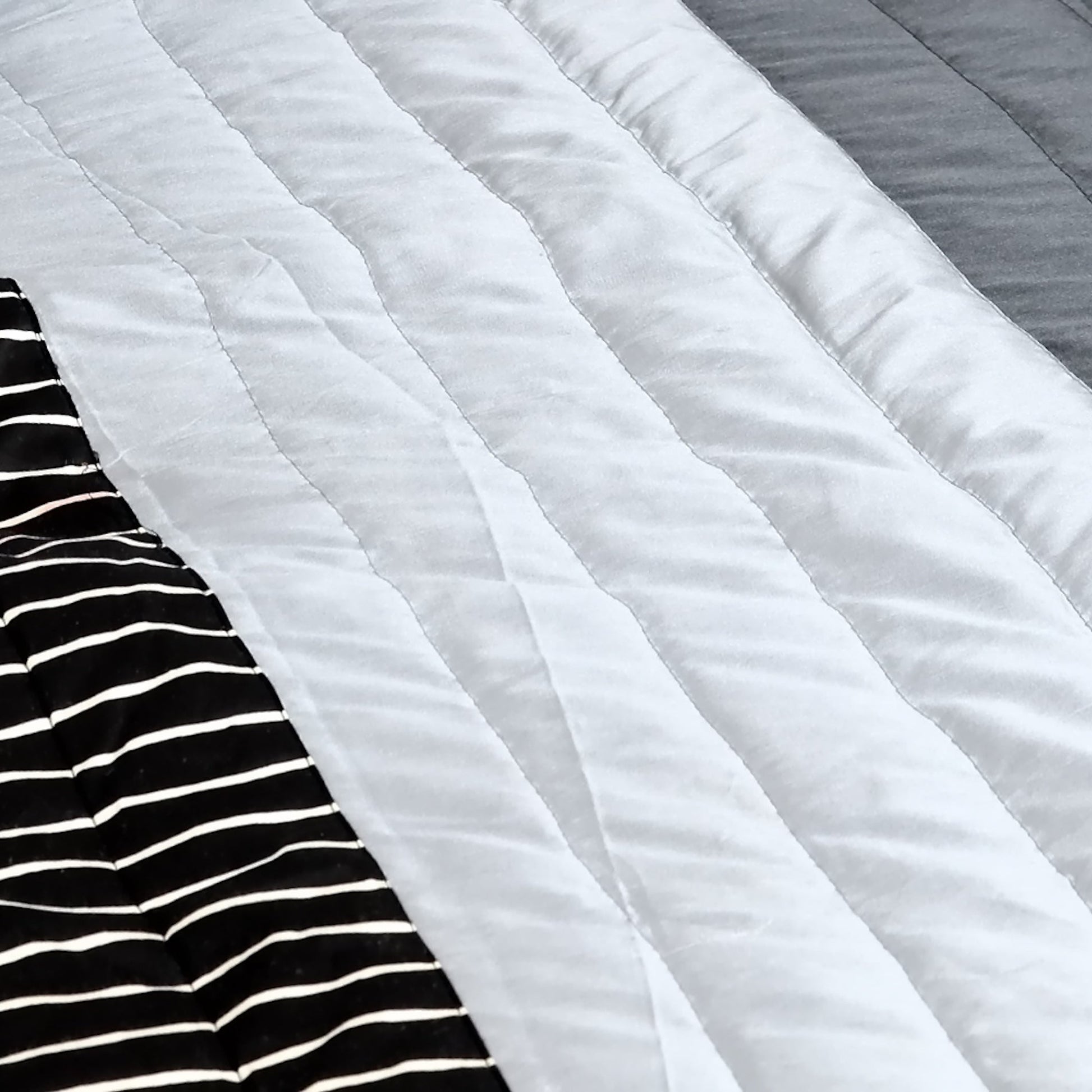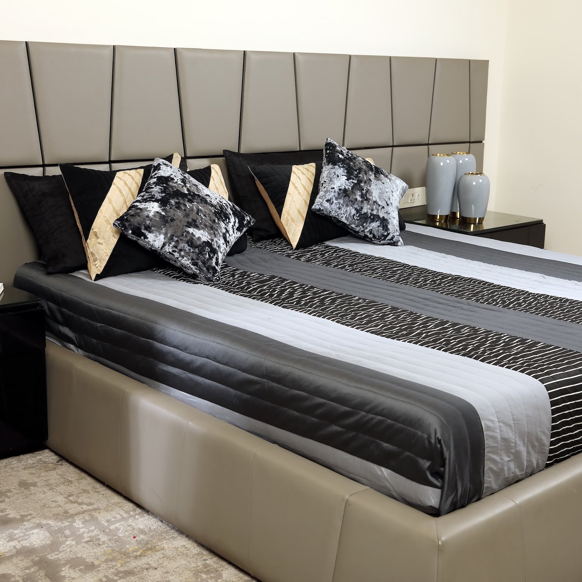 Elevate your bedroom’s aesthetic with this sleek and modern black and grey striped bedcover. The fine silk fabric adds a subtle sheen and smooth texture, while the quilted finish provides an added layer of comfort and structure. A sophisticated choice for contemporary interiors.
