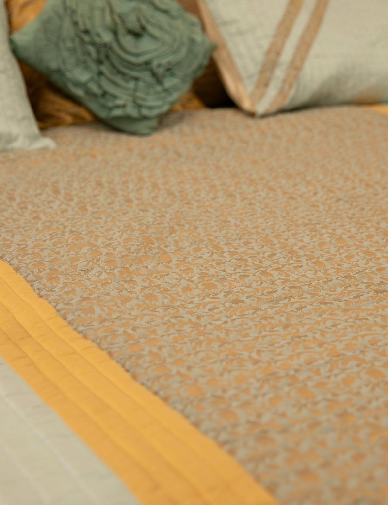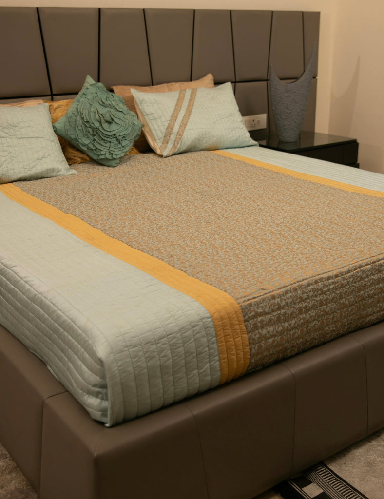 Fabric- Brocade/silk Backside- Silk Size - 92/99 Quilted with 2 pillow covers with cushion extra -1200/-