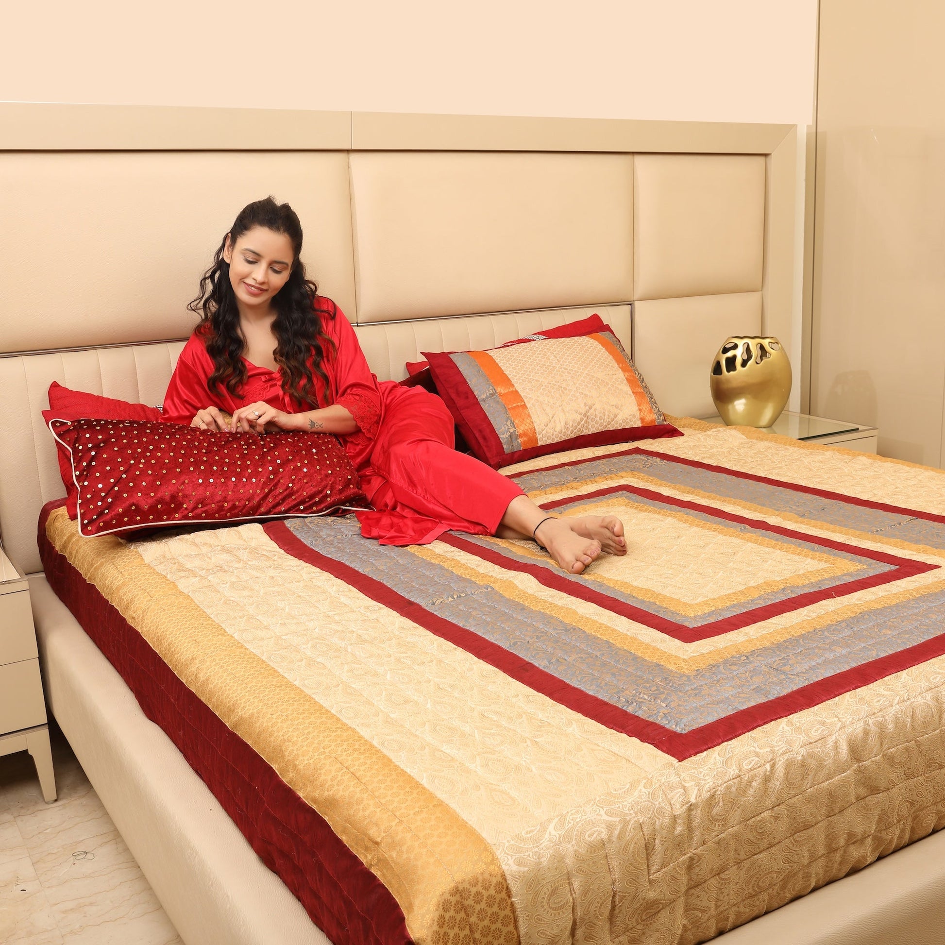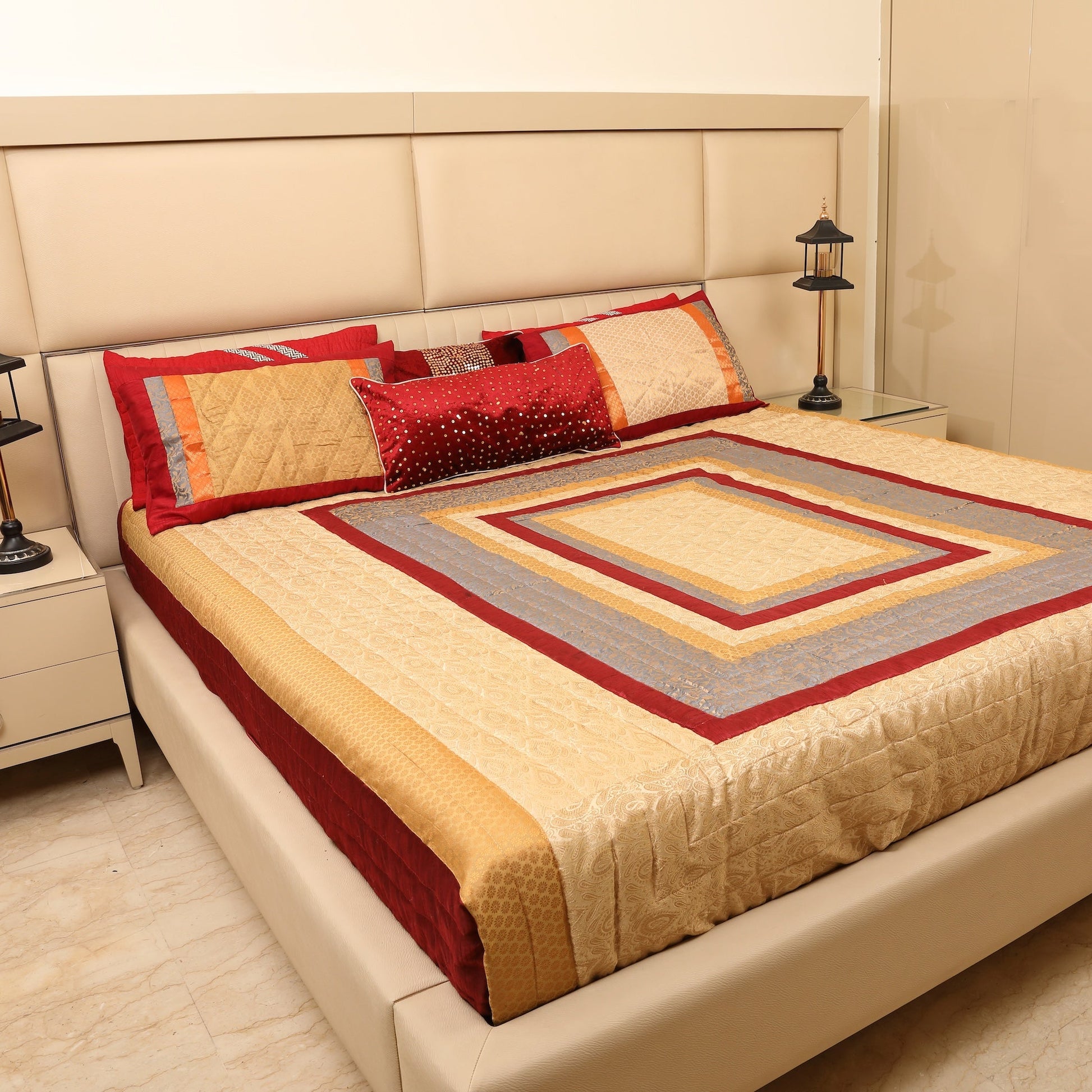 Elevate your bedroom with Brocade Royale, a sophisticated quilted bedding set showcasing intricate silk brocade panels in beige, gold, maroon, and blue.