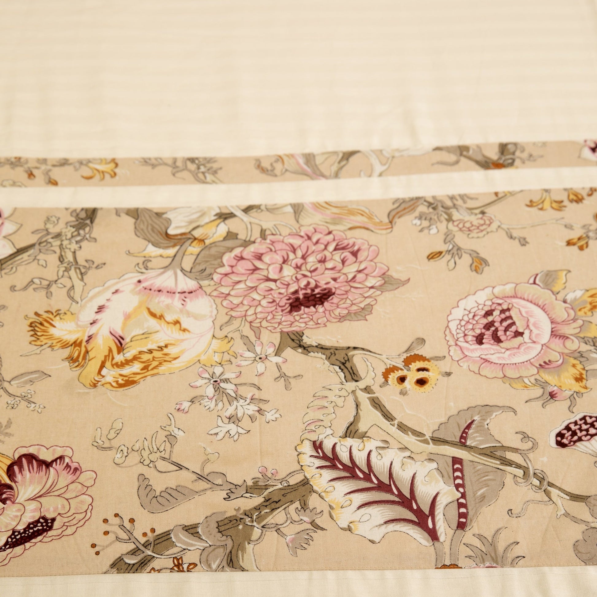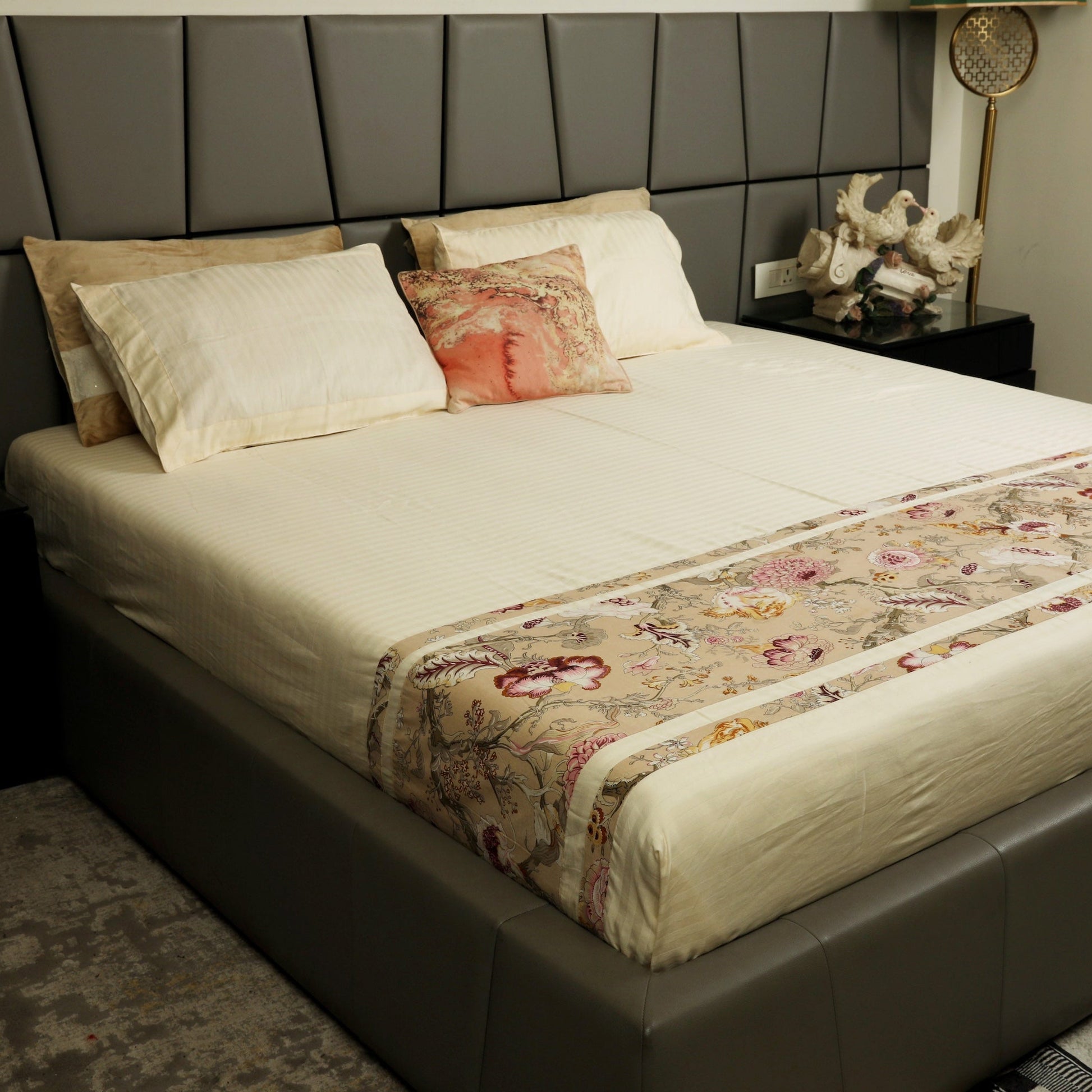 Champagne Flora bedcover combines understated luxury with everyday comfort. This 95 x 100-inch piece features premium soft cotton in a warm cream tone, enhanced by an intricate Anokhi print runner.