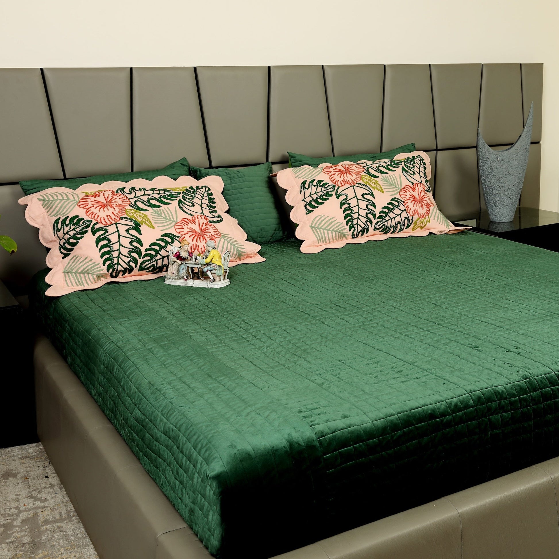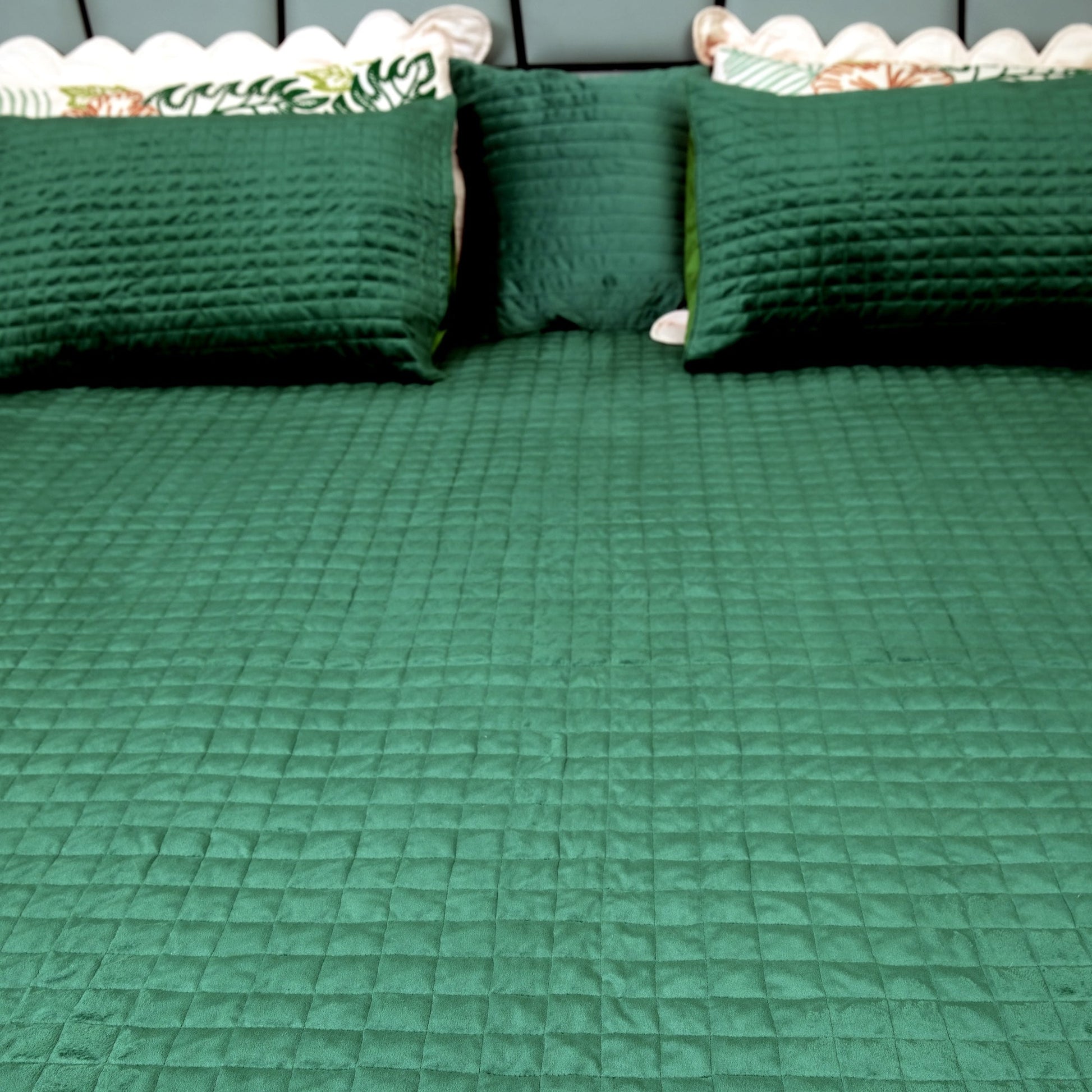 Emerald green velvet bedcover with a luxurious silk reverse. The reversible design offers velvet warmth for winter and silk coolness for summer, delivering year-round comfort with regal sophistication. Quilted finish ensures durability and elegance in every season.