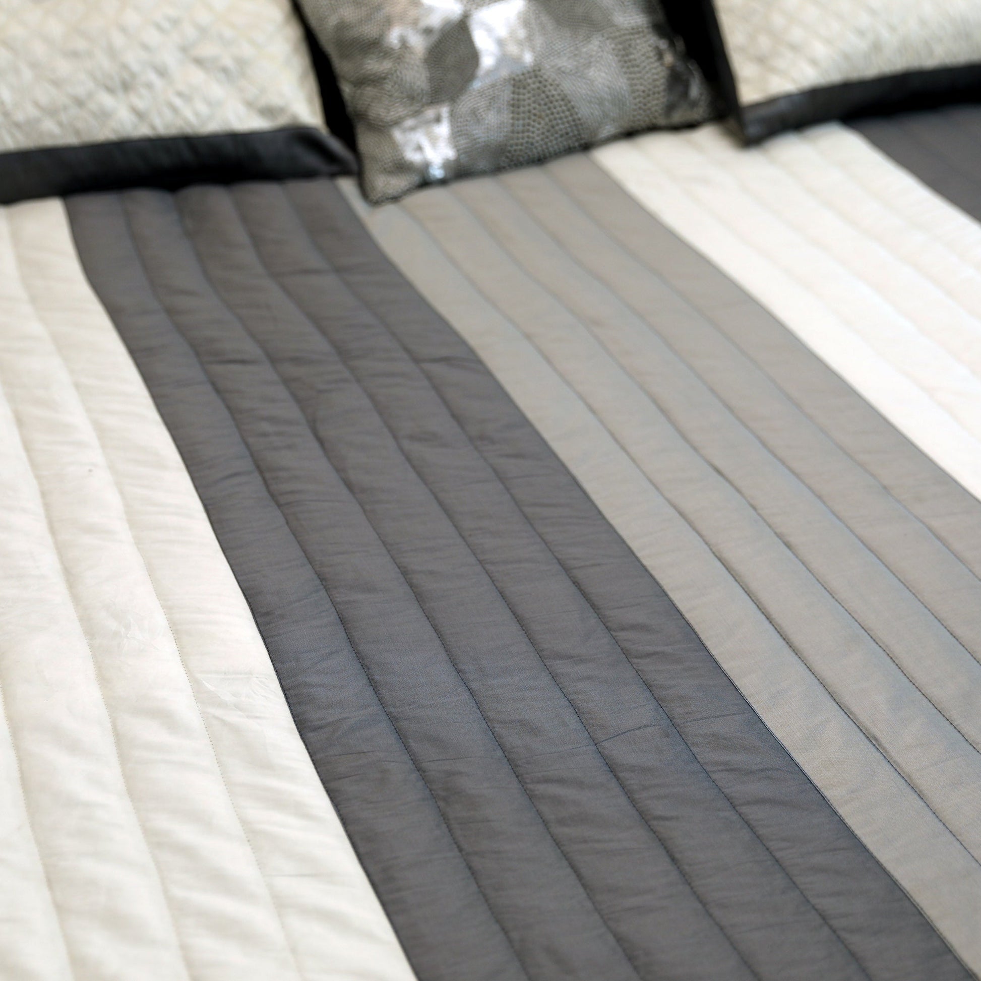 This grey and black silk quilted bedcover combines contemporary design with refined luxury. Vertical paneling and full quilting create visual interest while ensuring lasting durability. The premium silk fabric delivers a sophisticated sheen that enhances any bedroom aesthetic, making it equally suited for everyday comfort or special occasions.