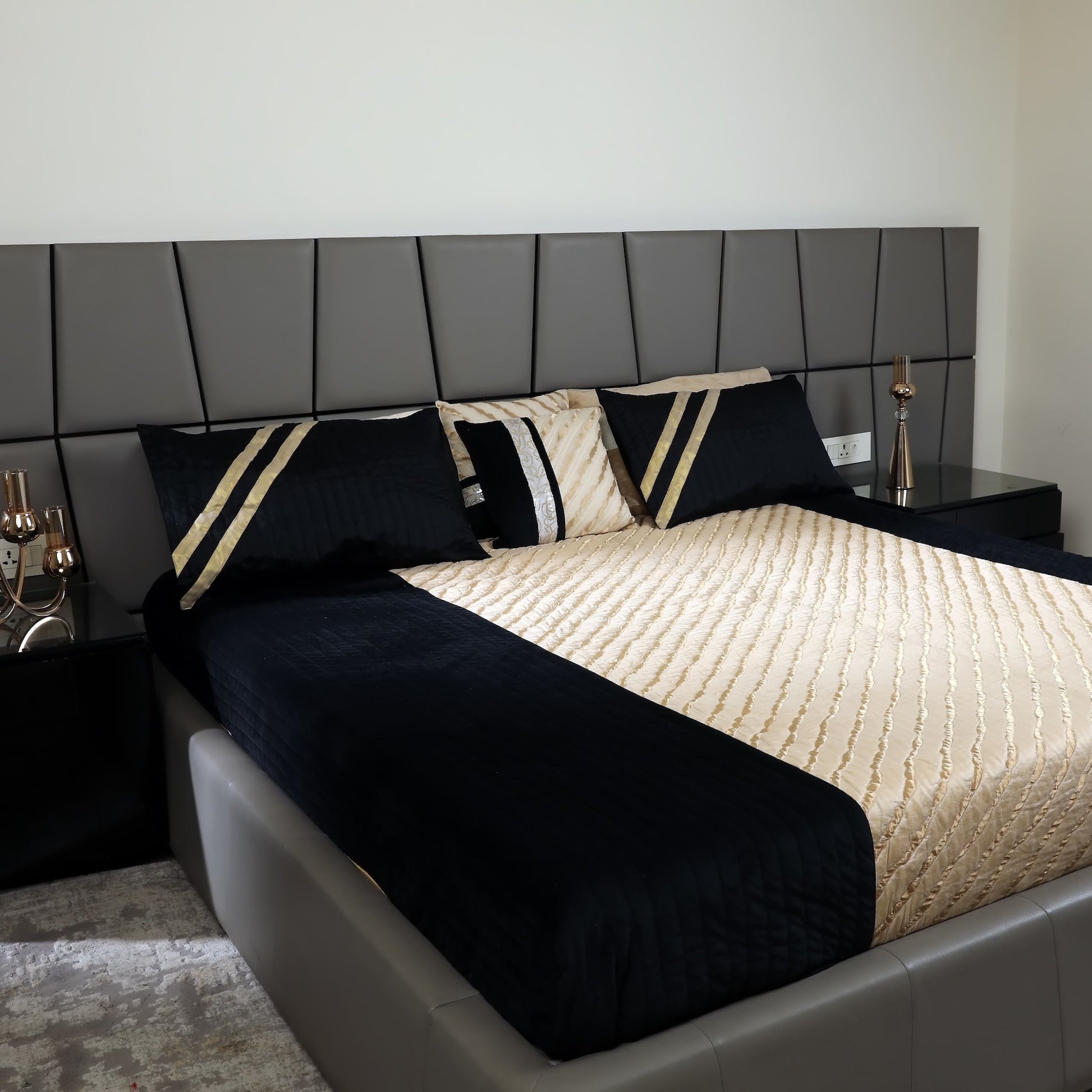 Transform your bedroom into a sanctuary of refined elegance with this striking quilted bedcover. Crafted from sumptuous jet-black velvet and lustrous golden brocade, it features bold velvet borders and diagonal golden stripes that command attention. The symmetrical design delivers understated luxury perfect for festive celebrations or everyday indulgence. A sophisticated statement piece that elevates any modern space.