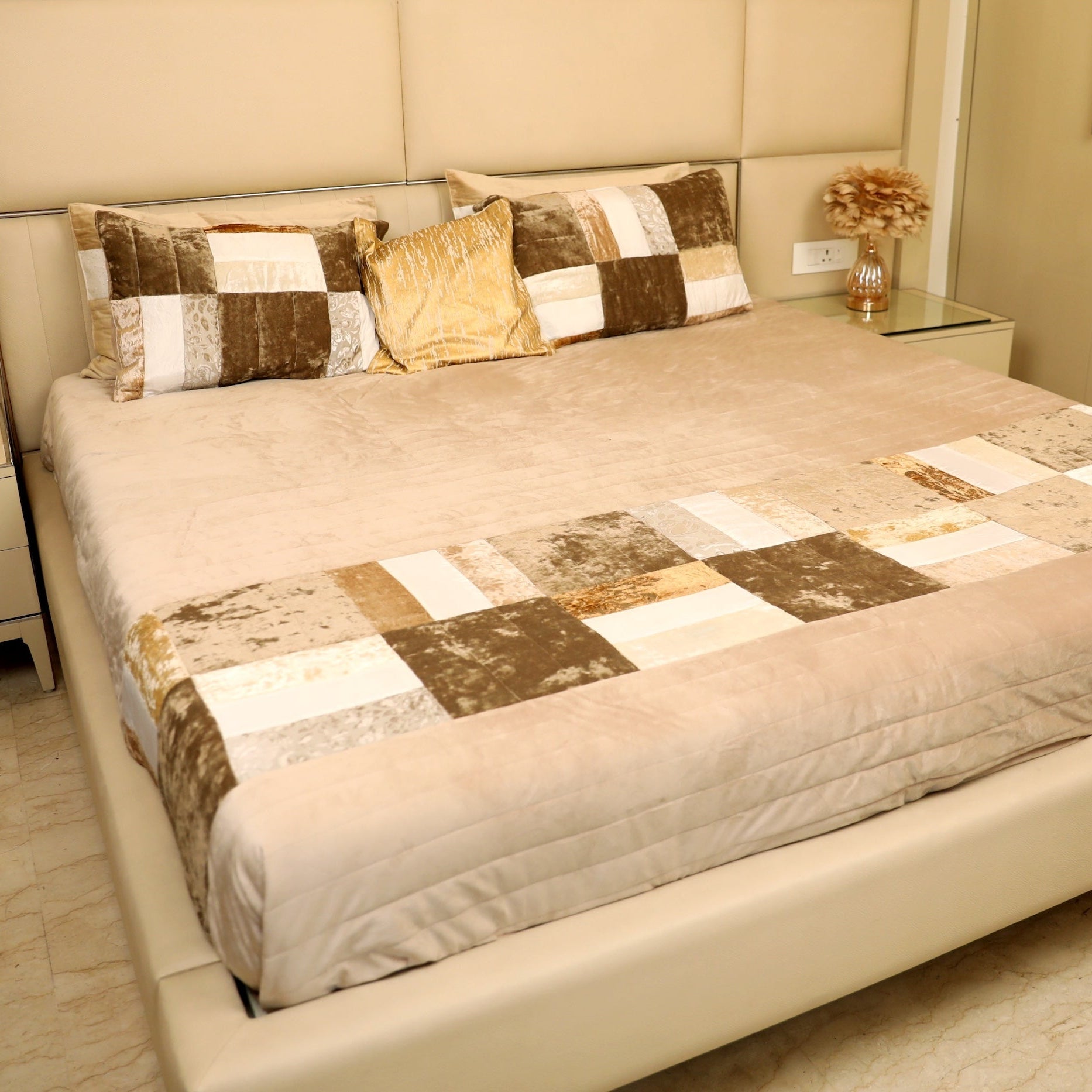 Elegant and soothing, this beige velvet bedspread features a textured runner in luxurious chenille and suede with cotton backing. Its soft cream and beige tones add warmth and style to your bedroom for a refined finish.
